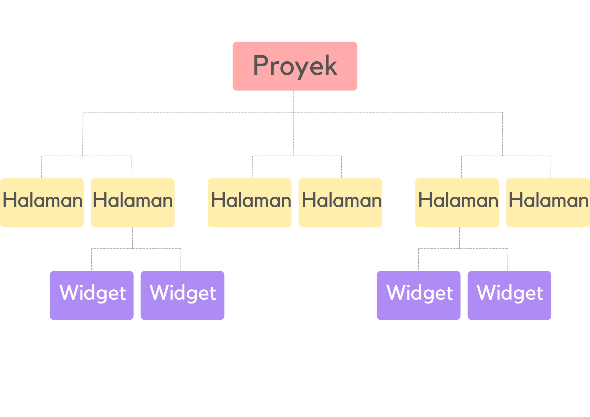 Suatu proyek dapat berisi banyak halaman, suatu halaman dapat berisi banyak widget. Setiap widget akan berinteraksi dengan bucket yang sudah kita tentukan.